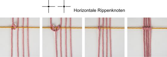 You will now need a piece of yarn that you lay horizontally across the 44 double strands and that is slightly longer on both sides. Fix this horizontal cross strand firmly to the table with extra strong tape. Tie all 44 double strands together with the horizontal rib knot.