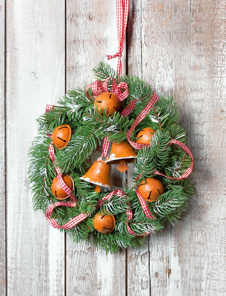 Give your wreath a new look, but stay true to Christmas. The bells and jingles consist of acrylic balls and bells. Paint them with rust paint and decorative snow. This works best with painting sponges. Black "slits" drawn evenly on the baubles with a black permanent marker give the baubles the "bell shape". You can achieve the perfect look by decorating the wreath with a decorative ribbons and knotting it on as a hanging ribbon.