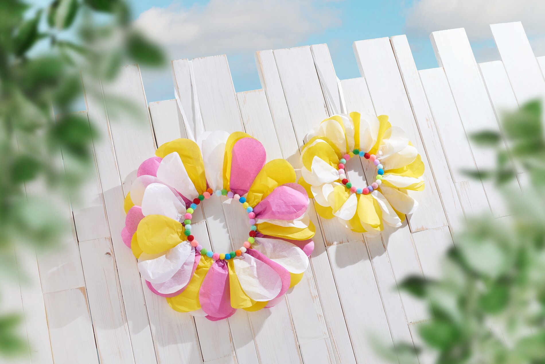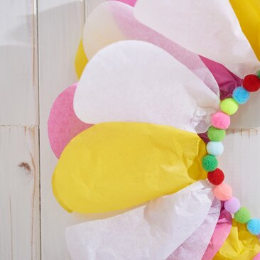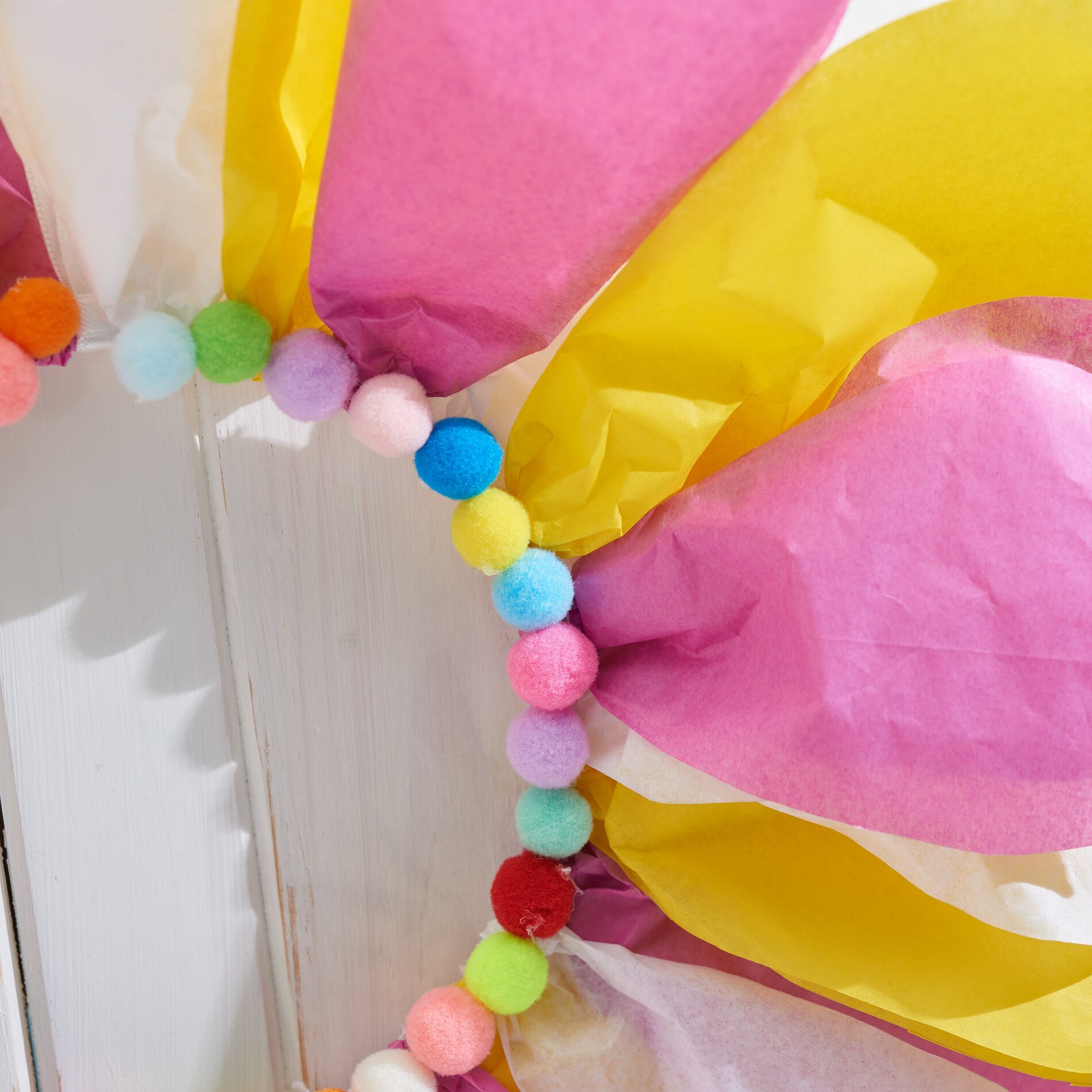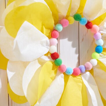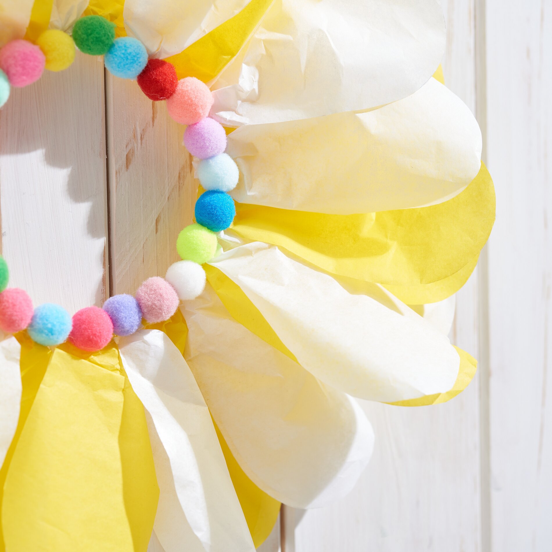 Are you looking for an unusual decoration for your home? This homemade flower wreath is also suitable for outdoor decorations as it is made from color-fast silk paper . The hand-folded blossoms and colorful pompoms make cheerful paper flowers for a garden party or as a cheerful decoration for every day.