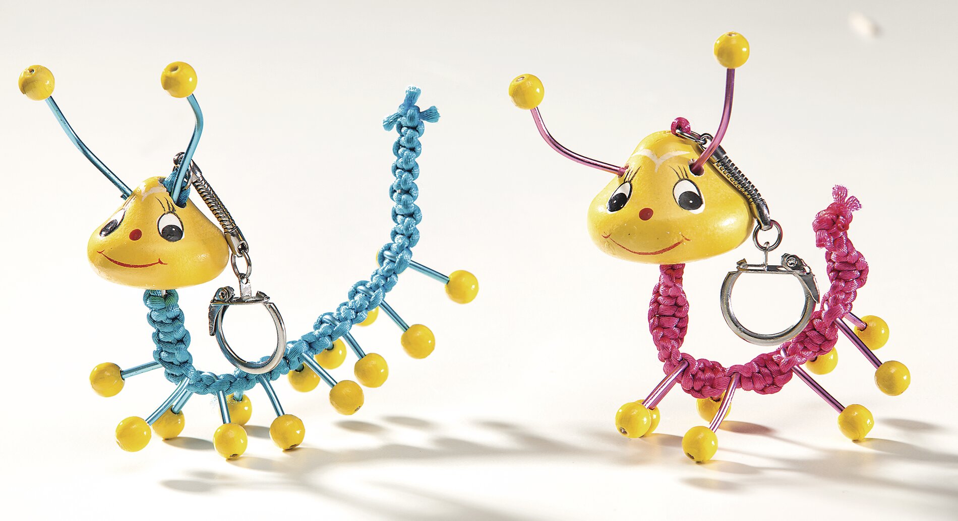 Whether with legs as millipedes or without legs as worms, the funny pendants are quickly tied with colourful satin cord. An integrated wire makes them flexible.