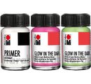 The set contains 15 ml of night glow paint each in the colours Green and Pinkas well as 15 ml primer in white for the priming of the underground, in order to obtain the best possible colour and lighting results. After drying, the colour is smudge-proof and partially lightfast. The fluorescent colour glows in the dark after and under UV black light. Please note that there are differences in colour perception during the day and at night.