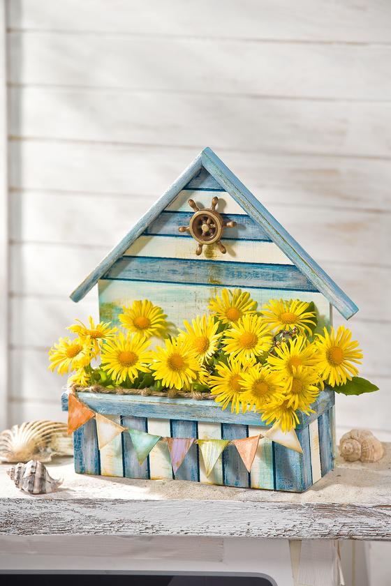 Finally glue knotted Jute yarn on the parapet, decorate the plant box with a steering wheel or a similar maritime accessory (hot glue).