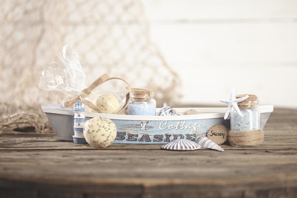 Treat yourself to the pretty decoration boat "Küstennebel" and enjoy a small "wellness oasis" in the bathroom. The boat is equipped with Napkin technique designed, equipped with self-made bath balls and Bath salts bottles. The small decorative shells and starfish are also self-cast with casting design!