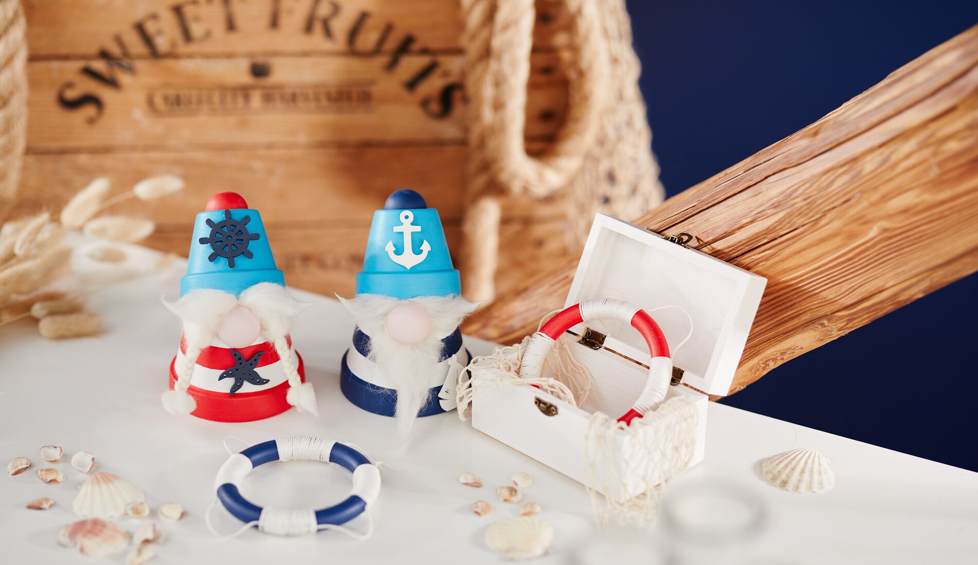 First, prime the 7cm clay pots in white and then paint the stripes horizontally with red and navy blue. You can use masking tape to help here and mask them off accordingly. The 6cm clay pots are painted in turquoise blue. Next, paint the wooden hemispheres in antique rose, navy blue and red. You can also paint the rings accordingly. The wooden hemispheres in antique rose are glued as a nose to the upper edge of the striped clay pots. The other two go on the turquoise "hats" so that the holes are covered.