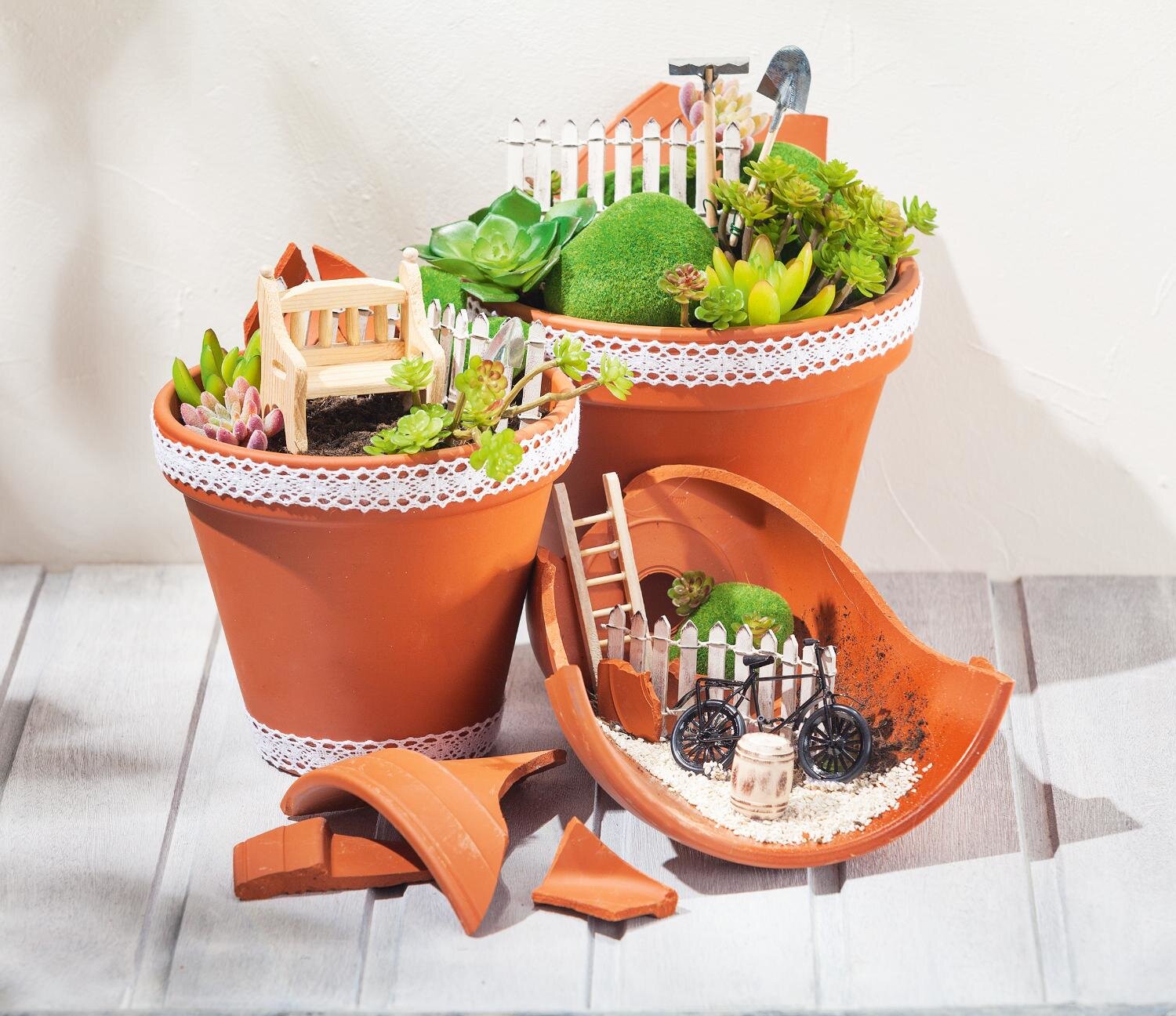 The basis for this craft idea are 3 Terracotta-pots in different sizes. Two pots are filled with topsoil or with Flower arrangement foam , the third one is broken in such a way that the bottom and a side wall form a "tub". Decorative accessories such as small artificial plants, mini garden fences and other miniatures will be prepared
