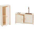 The kitchen block with cooker and spool measures 10 cm wide, 6 cm high and 3 cm deep, while the matching cupboard harmonises perfectly at 4.5 cm wide, 11 cm high and 3 cm deep. Made from plywood, these miniatures are durable and detailed.