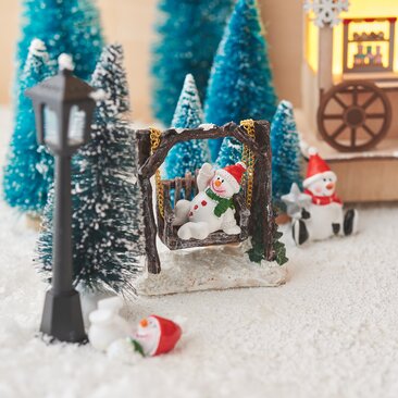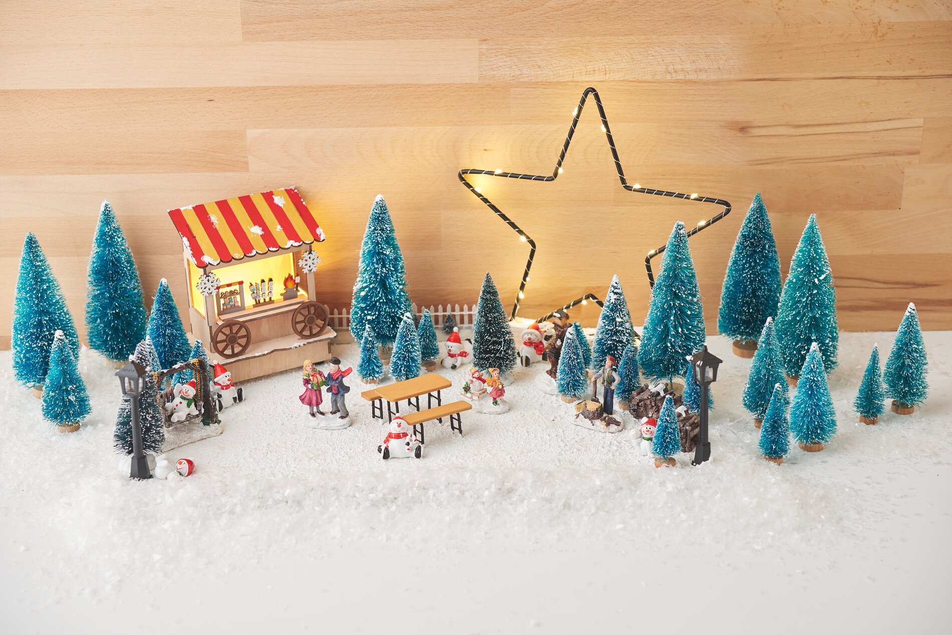 Then, while the snow is still wet, place the miniature fir trees, the miniature beer table set, the lanterns, snowmen, the miniature winter set and the star in the layer of snow. These accessories will be glued in place as soon as the decorative snow has dried.