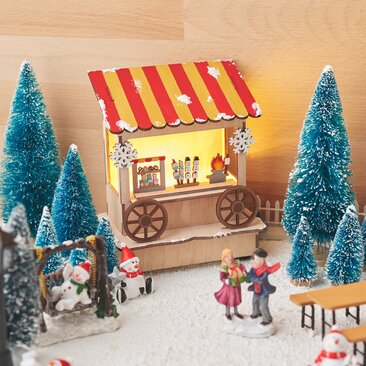 Therefore, make sure that you do not cover the battery compartment of the chain of light with the decorative snow so that it remains accessible. Once everything is completely dry, insert the market stall into the snowy landscape.