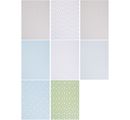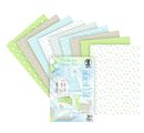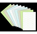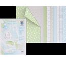 Beautiful 300\ g/m² motif photo cardboard "Frosty Blue" in DIN A4 contains nine sheets with nine different motifs in frosty tones. They show dots, stars of different sizes, fir trees, snowflakes and stripes in the colours Light green, Beige, Light blue and white.