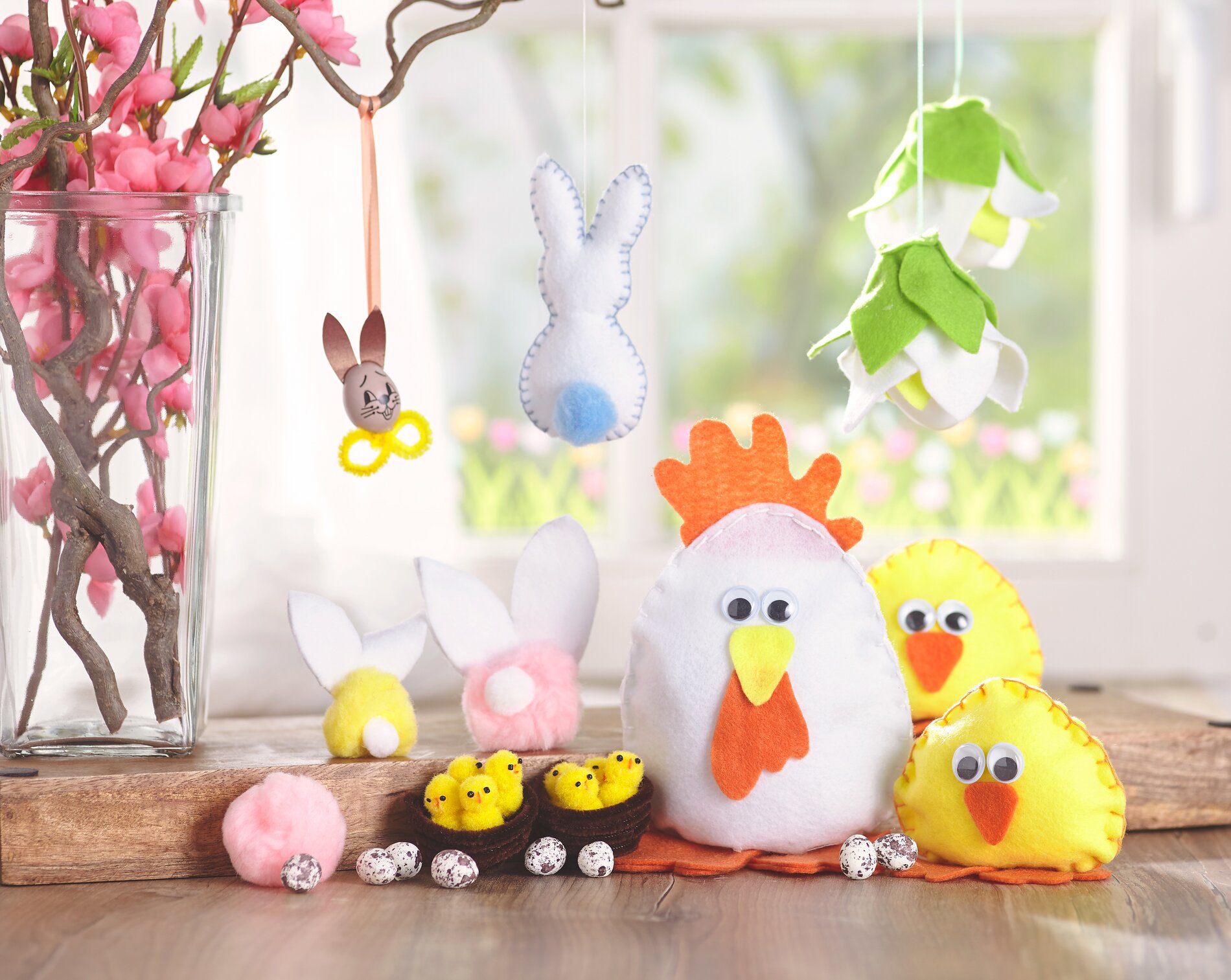 For rabbits , rooster and chicks you need two felt bodies each. These are simply sewn together with Stickwtist and filled with cotton wool. For chicken the comb is sewn in at the same time. The chick and chicken feet, beaks, eyes are designed with Handicraft glue . The rabbit gets a small mini pompon and a small stub tail.