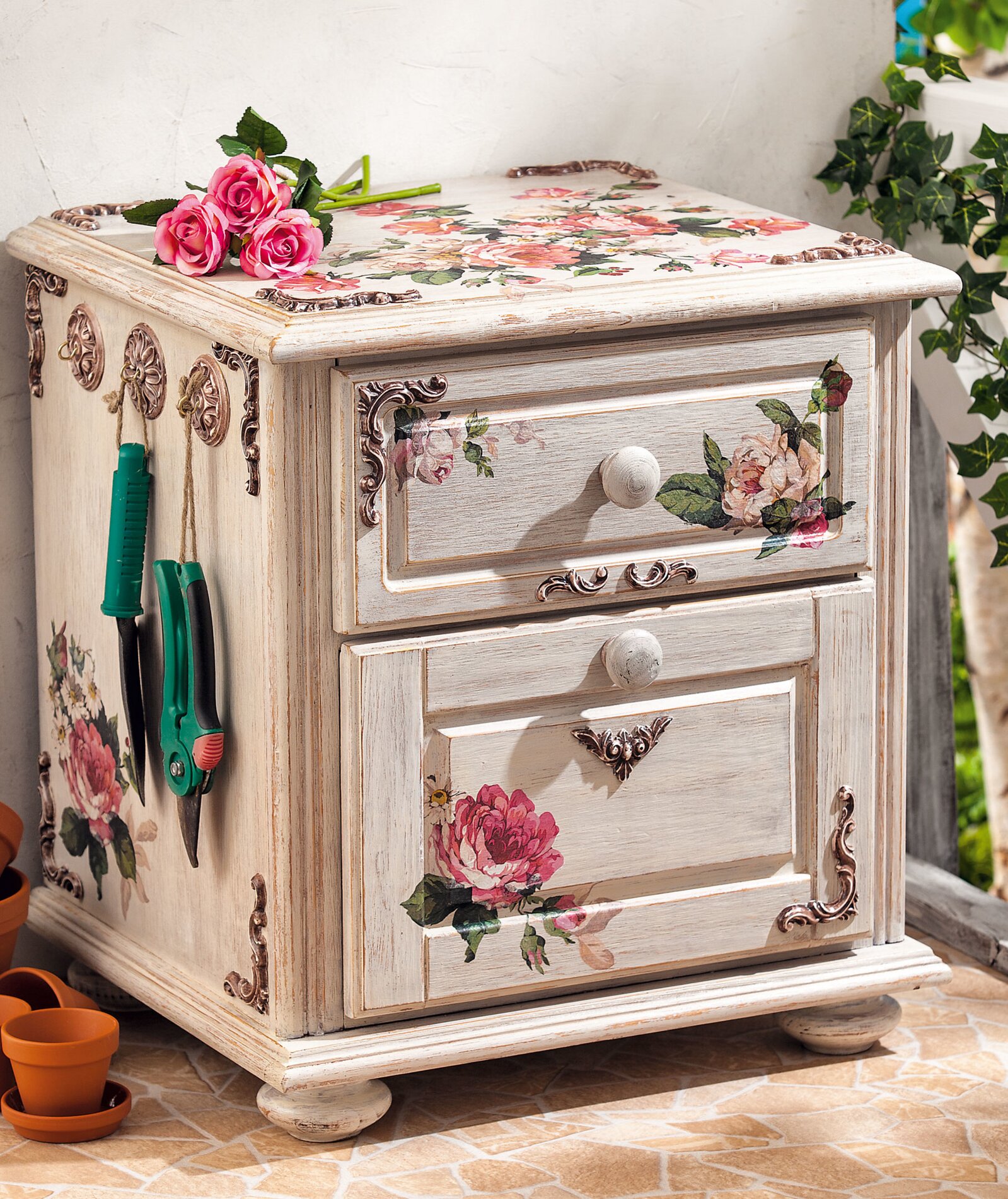 This old bedside table becomes a beautiful balcony furniture with large roses made of motif straw silk and with self-cast ornaments. It defies wind and weather thanks to a weatherproof seal.