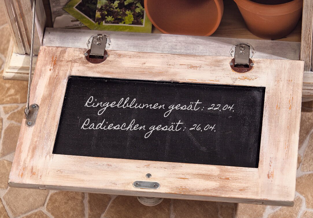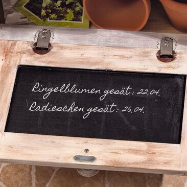 The inside of the drawer is coated with wipe look and above all with Board paint . This way you can remember exactly which flowers you sawed and when.
