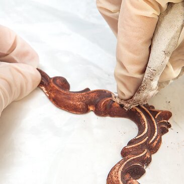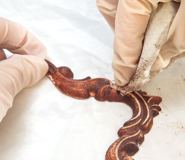 The ornaments of the cabinet are cast with casting compound. After drying, simply smooth the edges, paint them and create an antique look with Sandpaper .