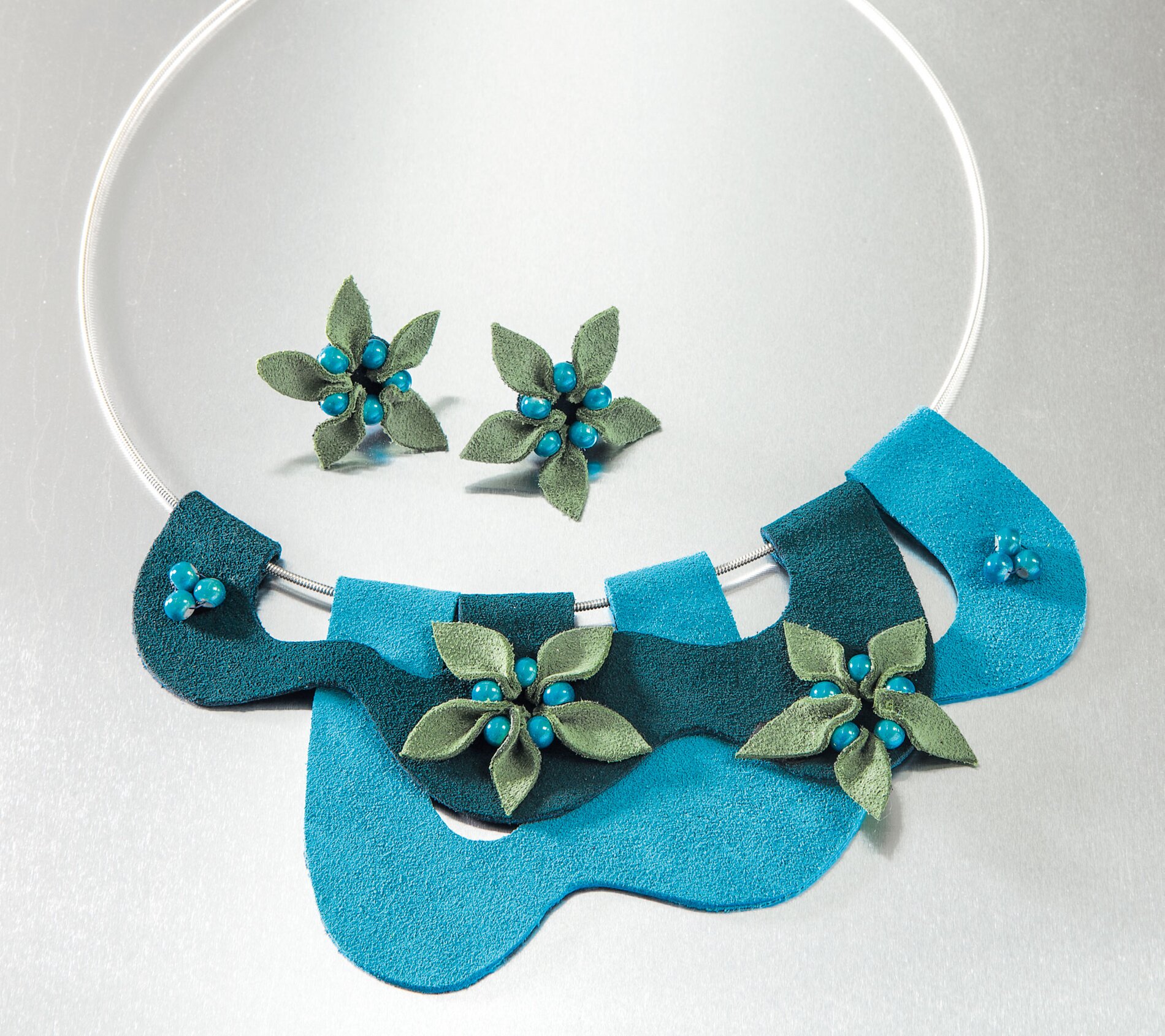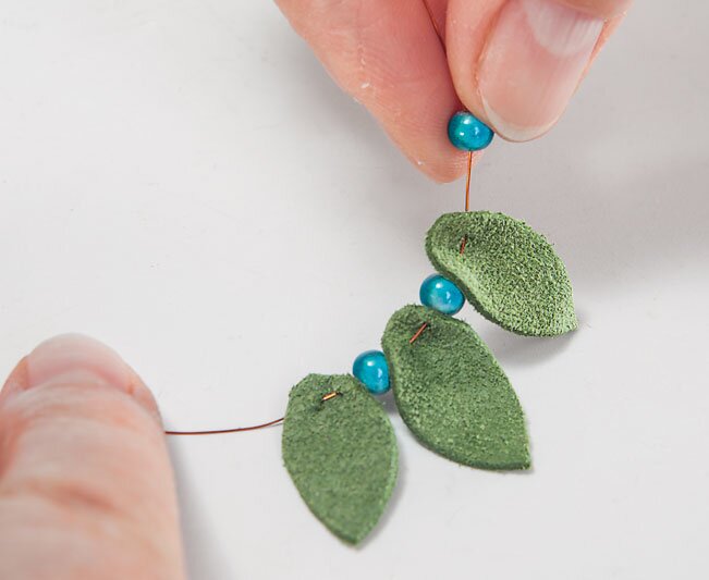 Thread alternately five petals and 5 beads on a piece of enamelled copper wire, twist the ends together. Glue the finished flowers on the leather and decorate them with single beads.