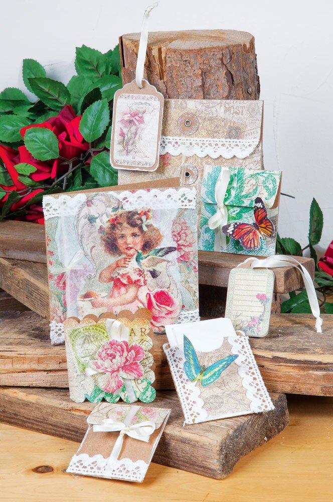 This card set offers you the possibility to personalize greeting cards, gift tags and much more. Beautiful motifs can be found in the straw silks, which harmonise wonderfully with the self-adhesive lace. The current vintage look is perfect for this. Design your written greetings with these wonderful unique pieces.