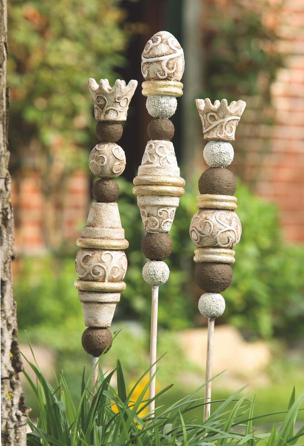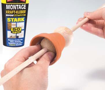 Each garden plug consists of Wooden balls, rings, Terracotta-pots, a round rod and Modelling clay. Put the elements on a round rod in various combinations for testing. To make it easier to push the Wooden balls onto the Plugs , the holes may need to be enlarged with a wood drill (Ø 8.5 mm).