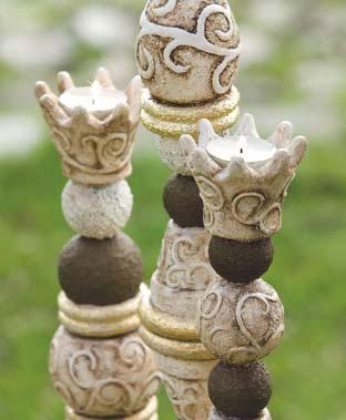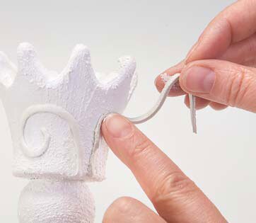 Use a small Terracotta-pot as a base for each crown. Cover the pot with Modelling clay and form the mass that protrudes over the edge of each pot, the teeth of the crowns. Fasten all elements one by one with mounting glue and let the glue dry for at least 24 hours.