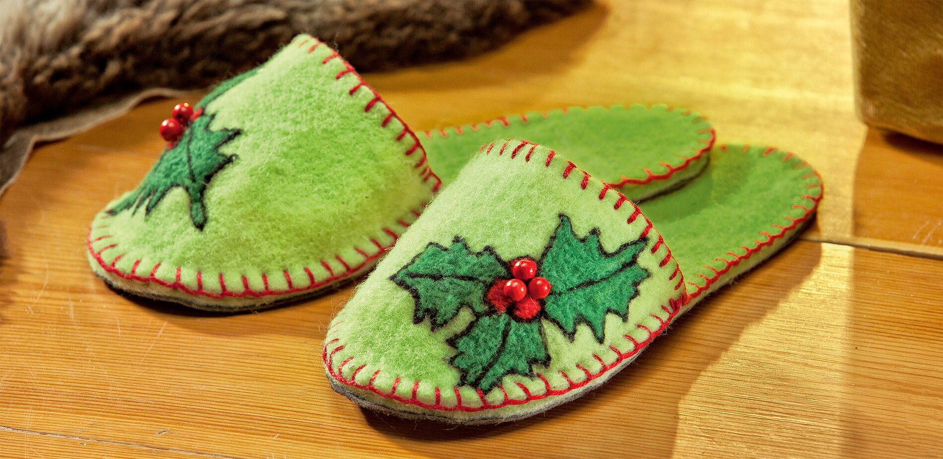 Keep it yourself or give it as a present - the decision is difficult here. The fluffy slippers are sewn in two Felt ribbon colours and have a stable, non-slip sole. With the large felted Ilex motifs and the chic red decorative stitching they will become your favourite pieces.