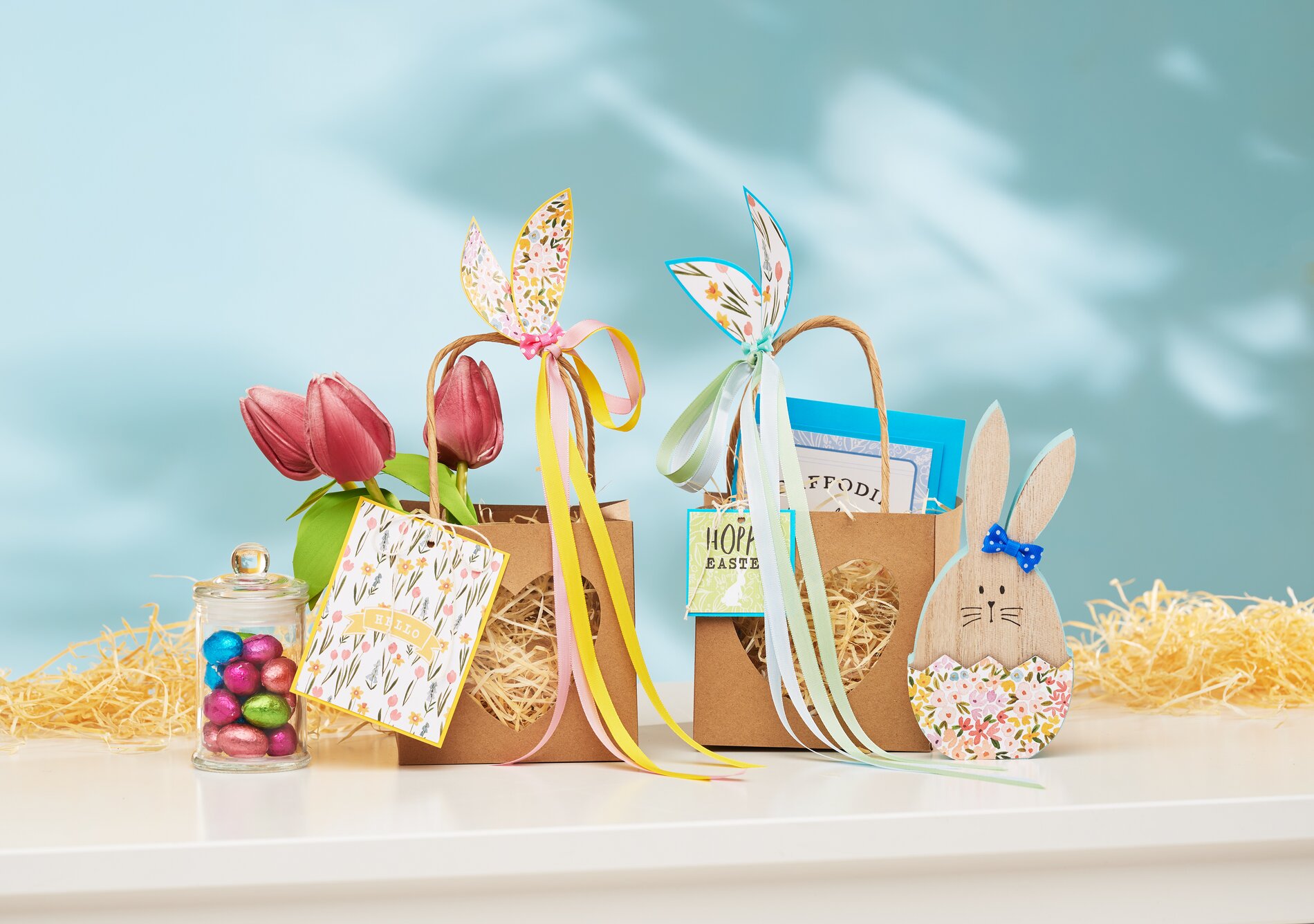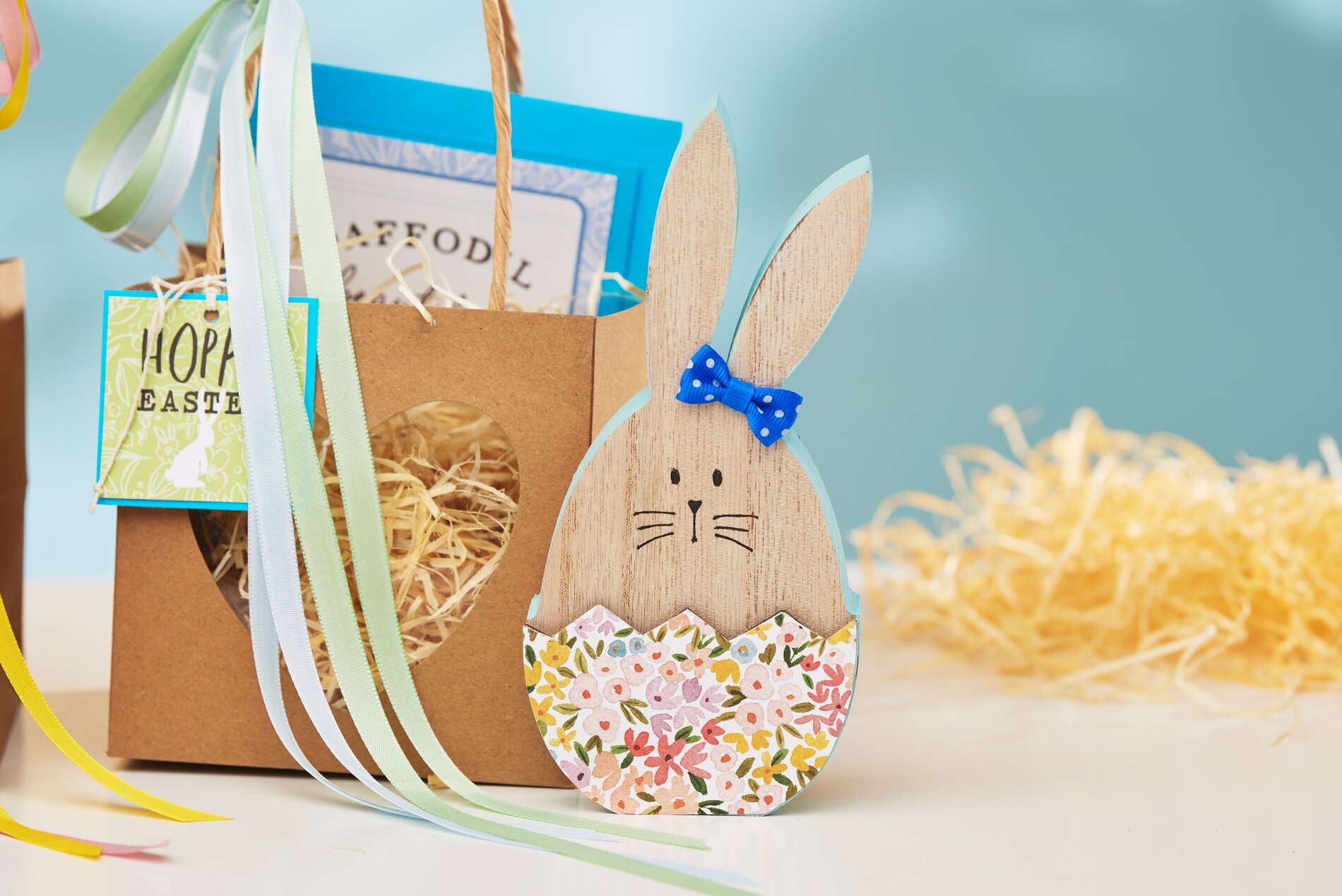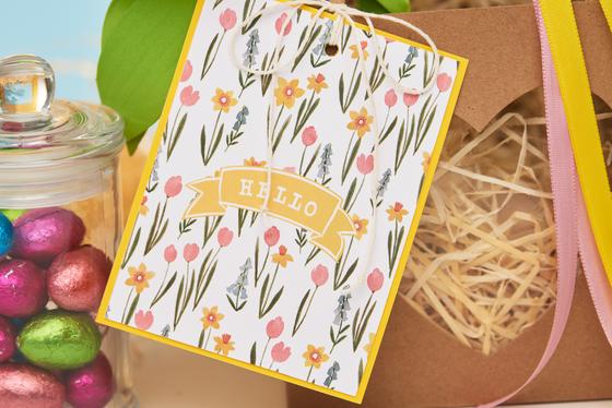 You are free to choose the size of the ears. However, you can orientate yourself on the size and shape of the ears of wooden bunny "Bonnie". After you have decorated the ears with some additional paper, you can glue both ear parts together at the bottom of the tips. Now punch holes in the tags and pairs of ears with a hole punch. Use warp yarn to tie the whole thing to the bag. To add a finishing touch, you can glue on small mini bows.