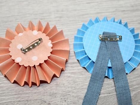 Once you have finished designing your actual rosette, you can also attach ribbons to the back. Finally, attach the pins using the hot glue (in this case, this one is better than the handicraft glue one).