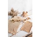 The raffia has a length ofapprox. 100 m and a width ofapprox. 7 to 8 mm . It consists of 100% wood fibers. The Raffia is biodegradable and can be gently washed by hand.