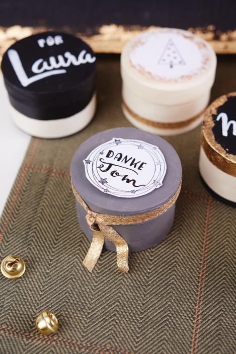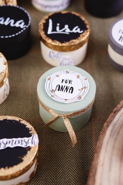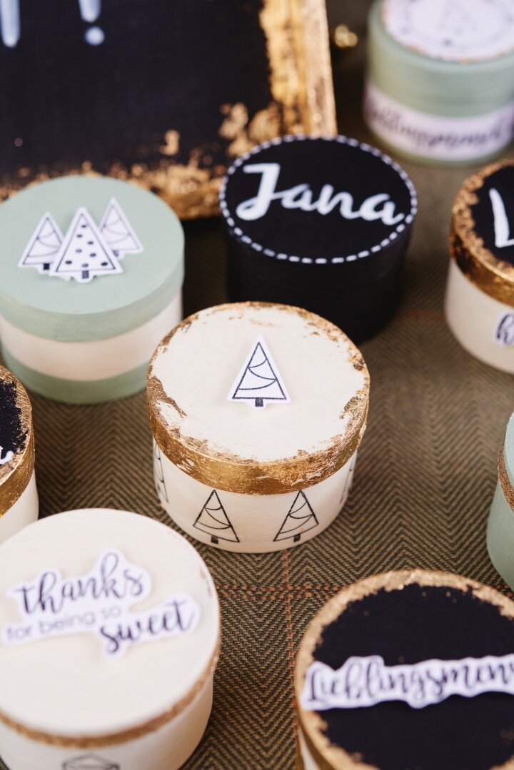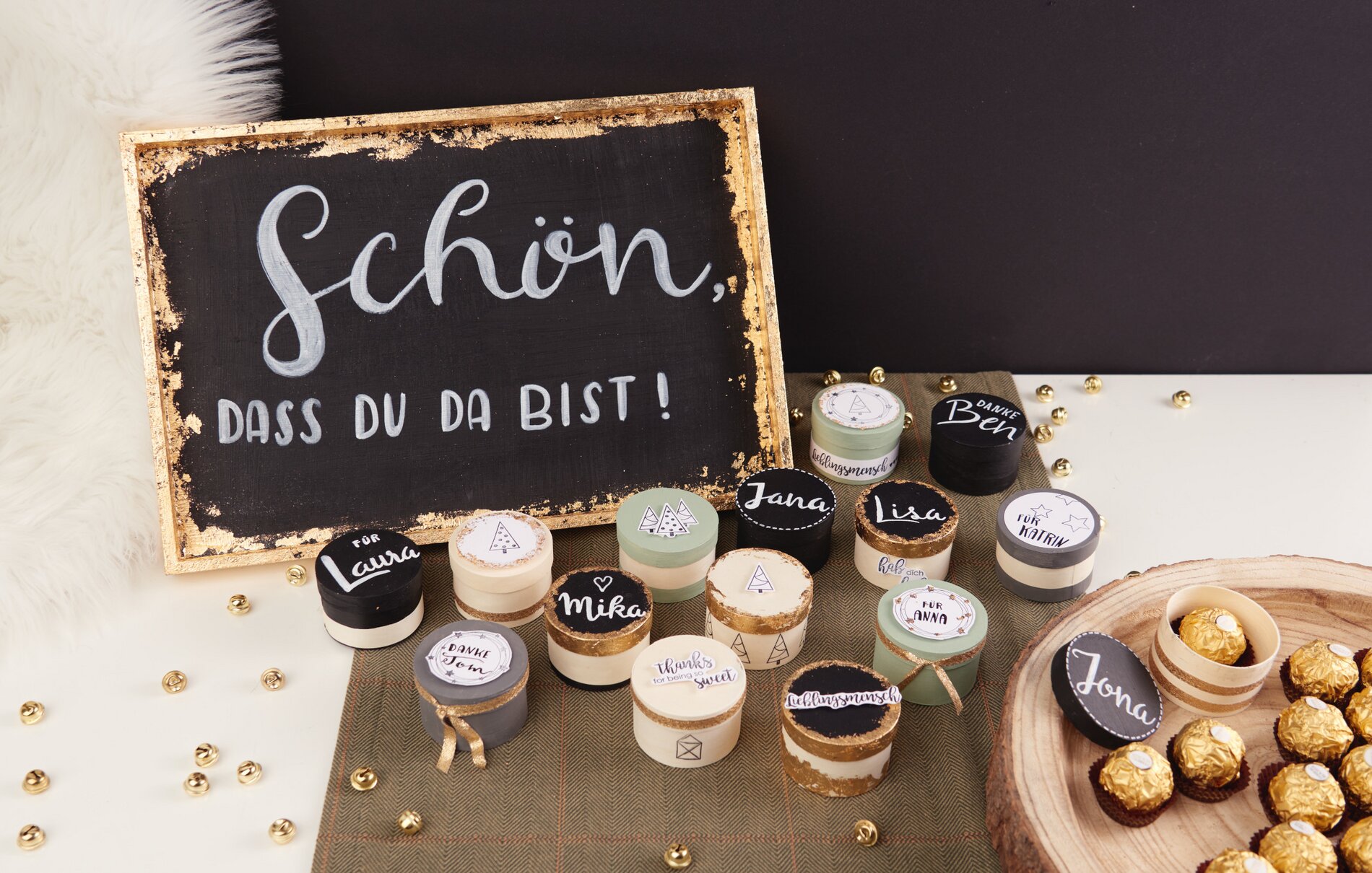The combination of contemporary color design, practical blackboard color and noble metal leaf gives a great look. Decorated with personal names or messages, you make with unique small gifts your guests a great pleasure!