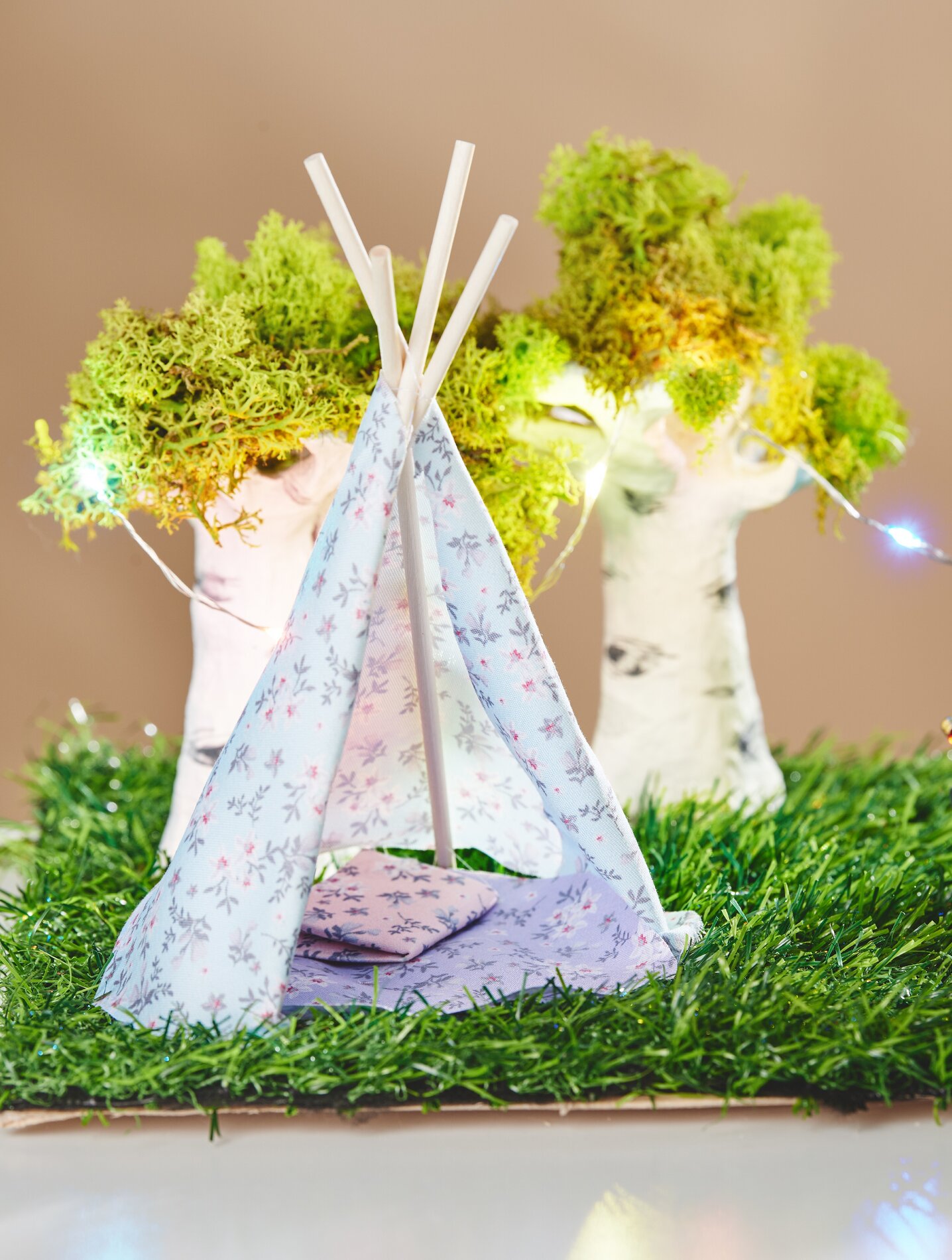 For the tepee, shorten four round sticks to an equal length (the length depends on the size of the tepee in your miniature world). Put the sticks together to form the tipi shape, fix them with some hot glue if necessary and use sewing thread to tie them together at the top.