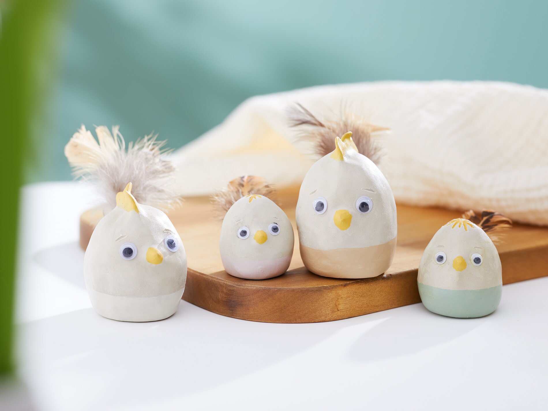 Shape the clay into balls of different sizes. Model the beak and, for some, a comb from the balls. Then shape the balls into a slightly oval shape and smooth the surface with a modeling tool and a little moisture. Poke feathers into the back of each bird as decoration and then leave all the modeled shapes to dry for approx. 24 hours.