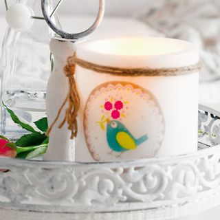 Its simple yet elegant design immediately catches the eye: the white, round shape with a diameter of around 10 cm and a height of 12 cm is ideal for the napkin technique. Here you can realise your ideas and personalise the candle to embellish your living space or create an unforgettable gift for friends and family.