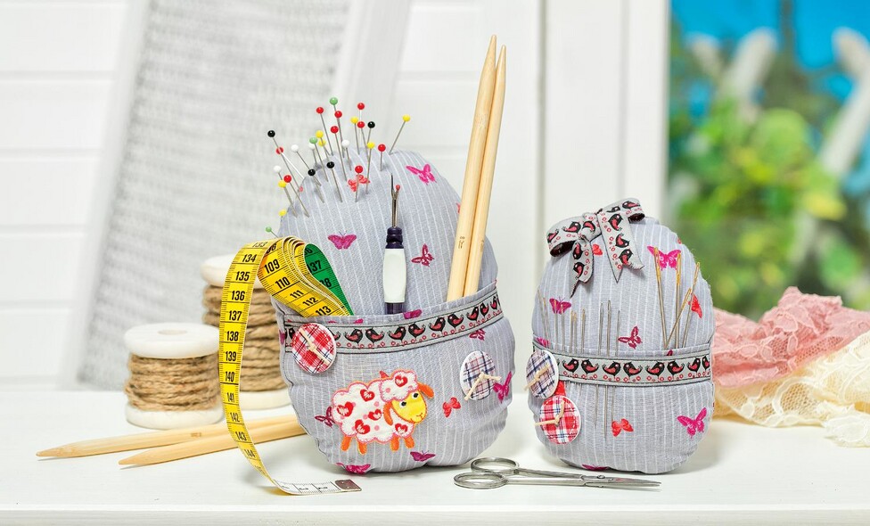 Use these instructions and simply sew the practical fabric eggs. You'll get a great pin cushion with pocket - perfect for your sewing hobby.