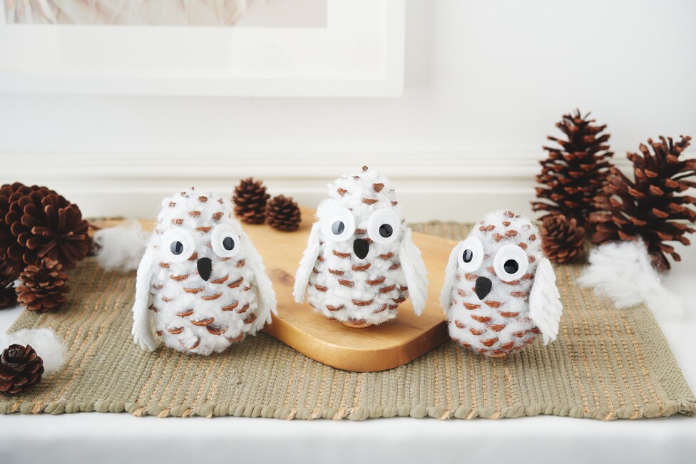 Attach the prepared wings to the pine cone with hot glue so that the owl takes shape. Press everything firmly and allow the glue to harden.