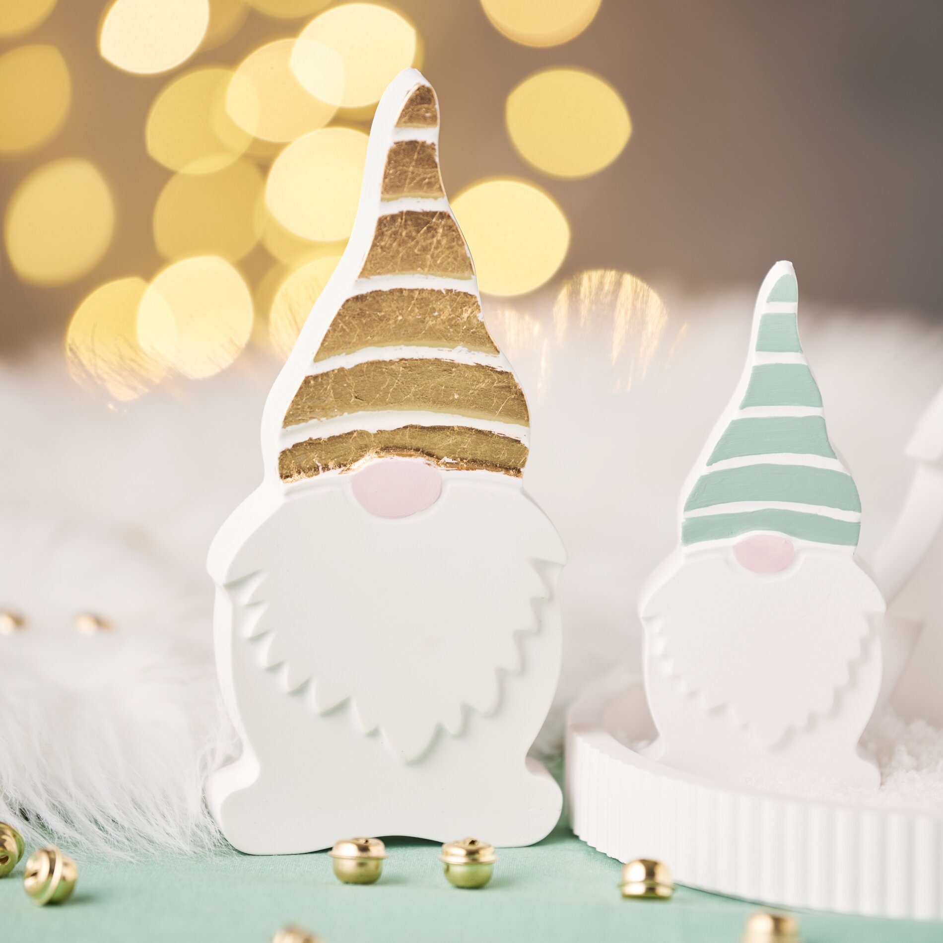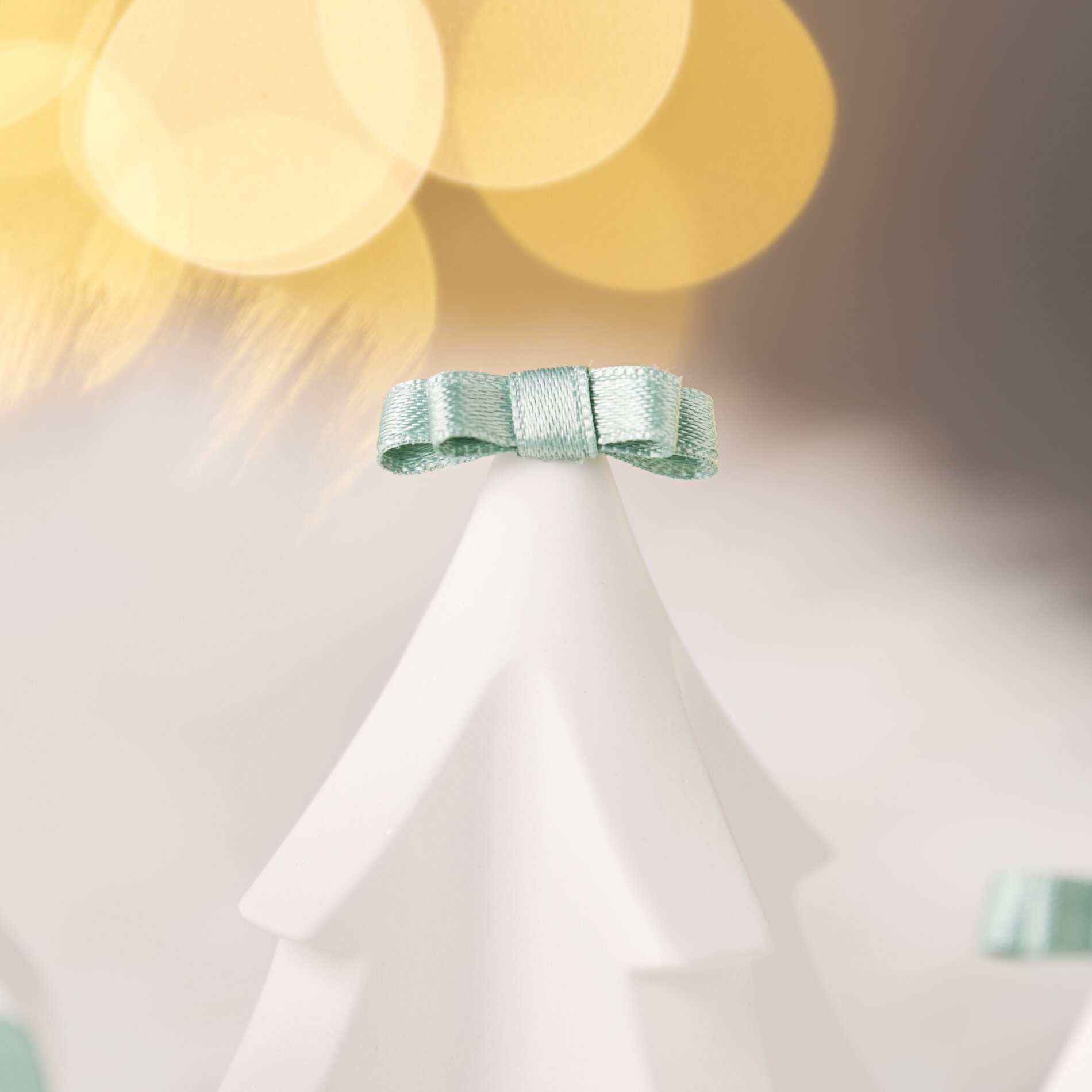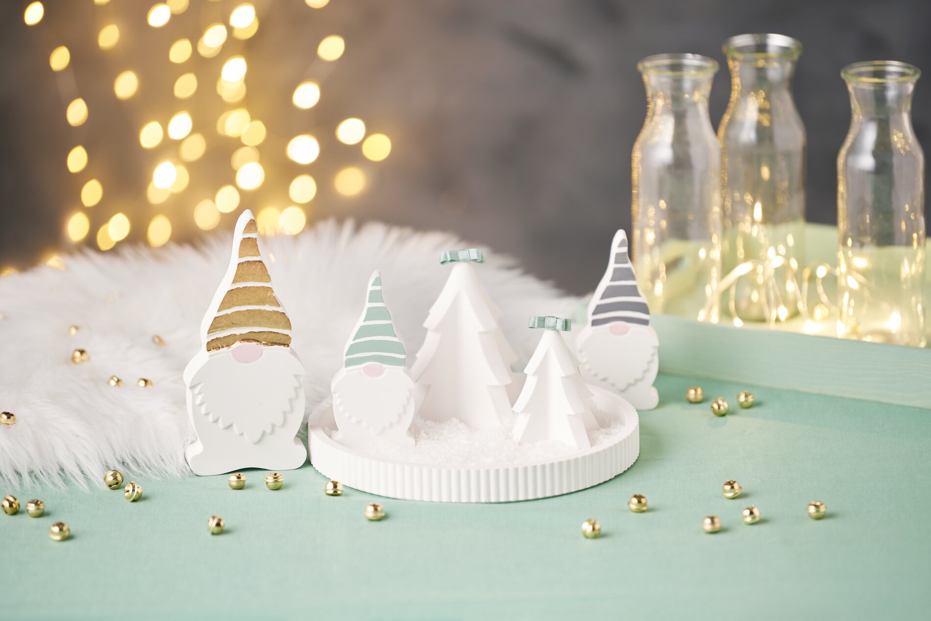 Now the creative part begins: paint the gnomes with acrylic paints according to your ideas to give them personality and character. To embellish your arrangement further , decorate the fir trees and elves in a plate with decorative snow and glitter. This will give you glittering, wintry accents. For the crowning touch, add extra charm to your decorative ensemble with bows made from satin ribbon at the top of the fir trees. For the bow, glue two rings of different diameters on top of each other and secure them with a piece in the middle.