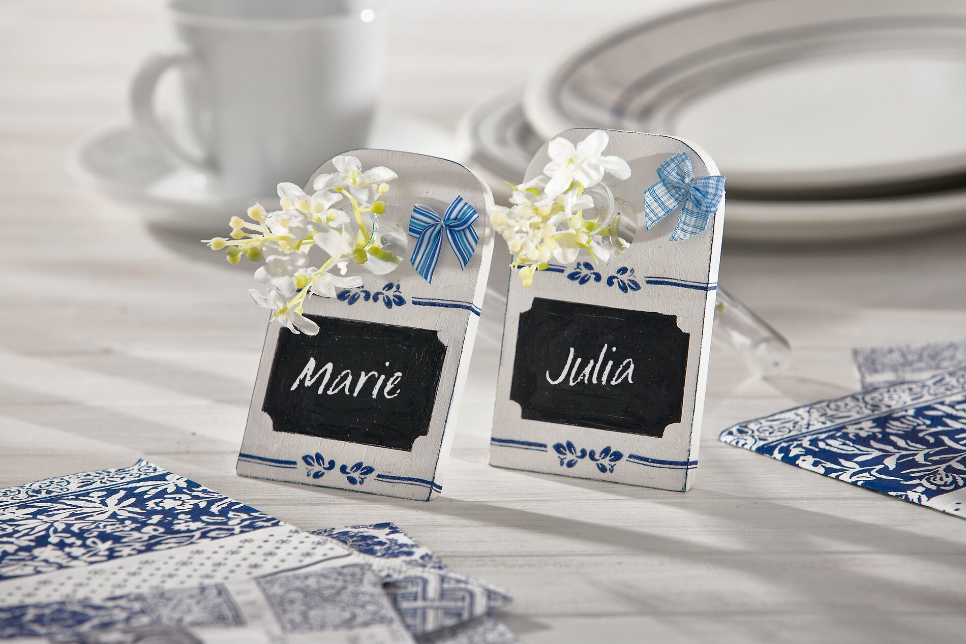 Start by applying white primer to the boxes and lids. Then cut the desired borders from Napkin and remove the two unprinted layers of paper. Spray the printed paper layer from behind with the spray adhesive and place it exactly along the bottom edge around the boxes and on the lid. If this doesn't work the first time, carefully pull off the Napkin and place it again. Carefully smooth out the thin Paper and then apply Napkin varnish from the inside out. After drying, simply cut back the remaining Paper along the edges with a scalpel.
