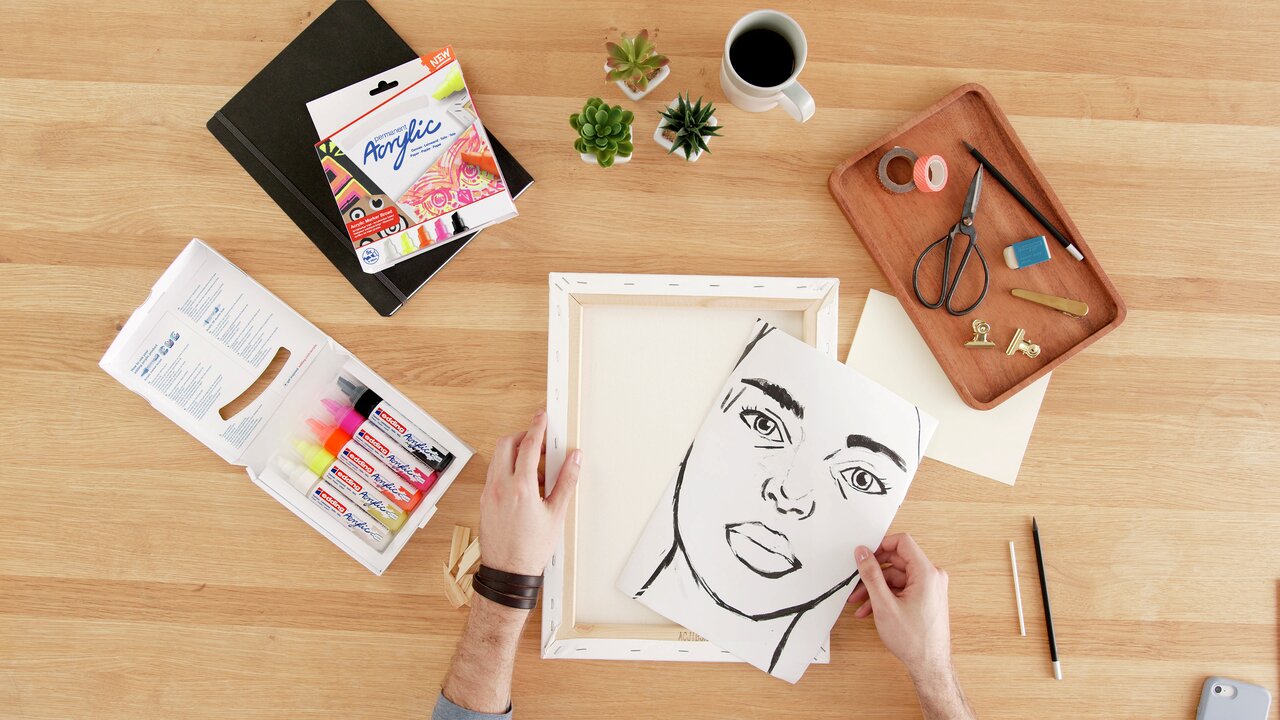 If you love bright colors and high-contrast artwork, you'll love this portrait. We'll show you how easy it is to create a portrait on canvas with edding acrylic markers in bright neon colors. If you prefer softer shades, you also have a great Selection of up to 26 opaque colors. The acrylic range consists of four different products, which you can use to paint large areas as well as create subtle accents. For an individual portrait, we recommend our template generator, with which you can easily create an individual template from a photo.
