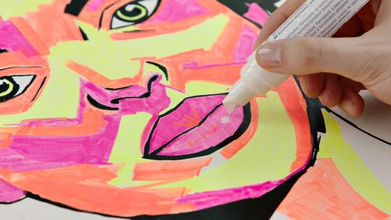 The eyes and lips can be highlighted with the fine tip of the chisel tip white acrylic marker.