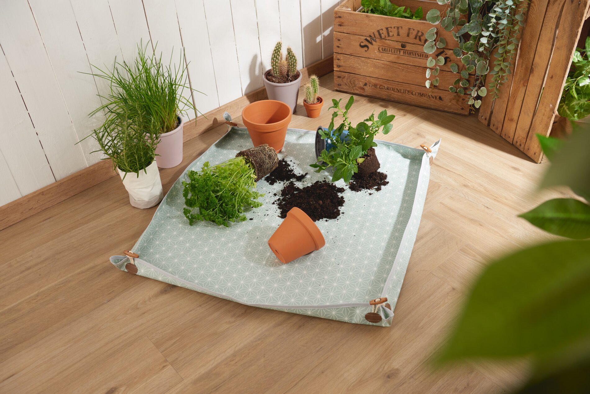 The homemade planting mat is very practical for repotting your potted plants. Topsoil can be easily wiped off afterwards and the pad can be stored away afterwards to save space.