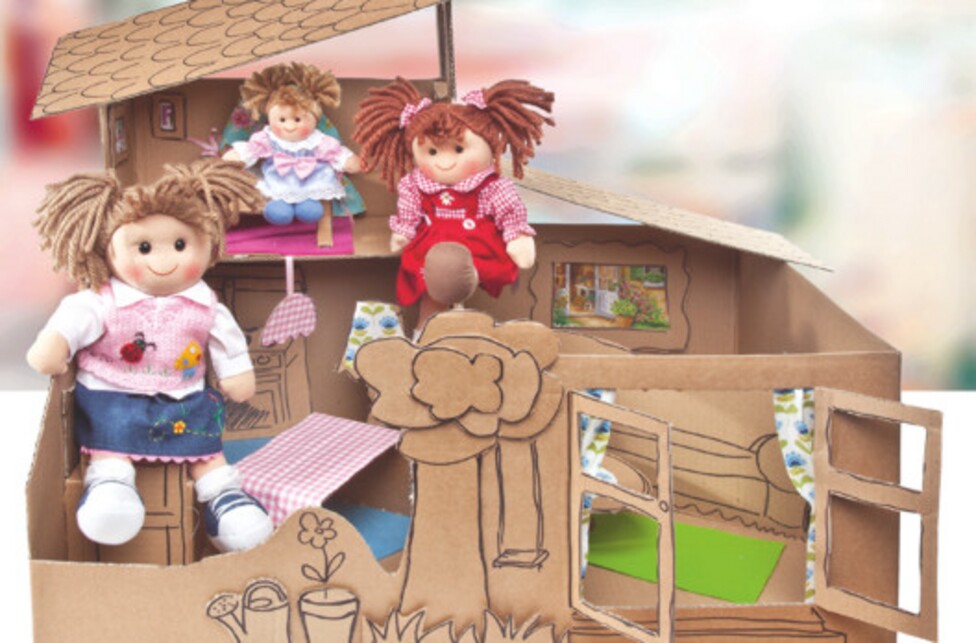 For the base frame, glue different boxes together with hot glue next to and on top of each other and cut the fronts partially open with a cutter knife to be able to look inside the house.