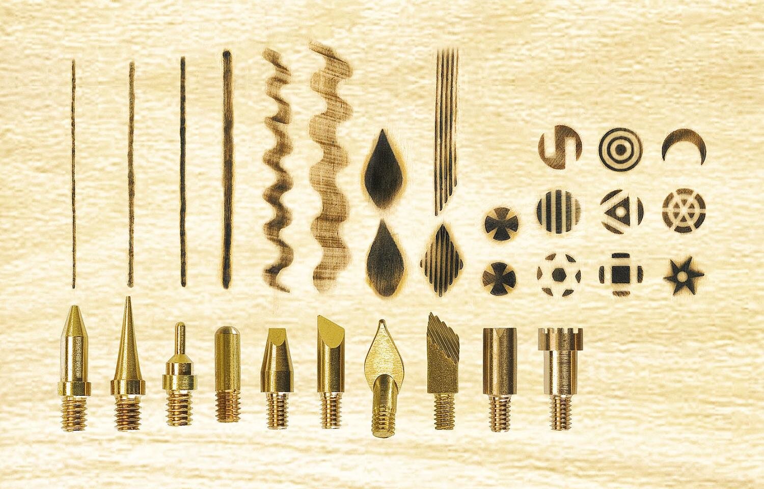At Wooden burning one paints or stamps with a hot Wooden burning pen accessoires on wood, on leather or cork. For this technique we have various branding pens or stamping stations in our assortment. These are delivered with different burning pens and stamps.