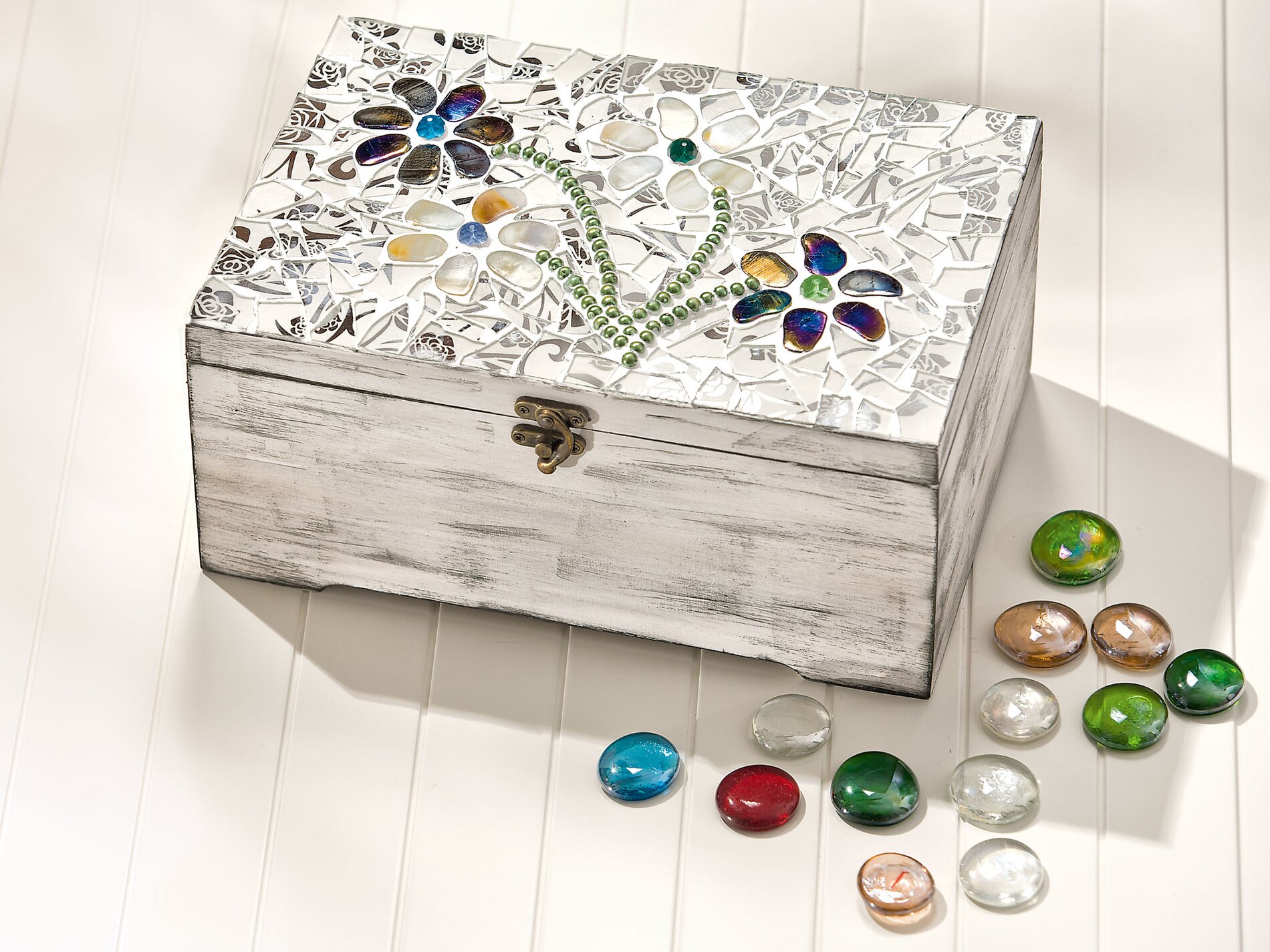 The old art of mosaic laying has lost none of its fascination to this day, but with new elements it is given a modern face. Iridescent glass stones are placed on this sturdy wooden box to form flowers, with transparent retro mosaic forming the background. A simple wipe technique gives the box a great look.
