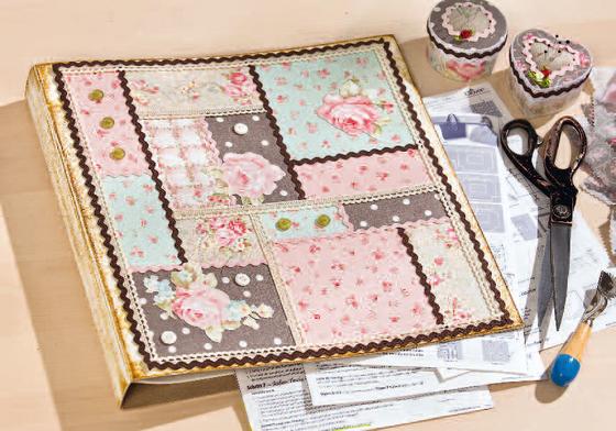 Spread a thin layer of wood glue on the cover of the ring binder and glue on the finished patchwork fabric. Paint well. Finally, stick on lace and zigzag tapes with tape-Ribbon . You can also fix single buttons and large fabric blossoms to make it look nice.