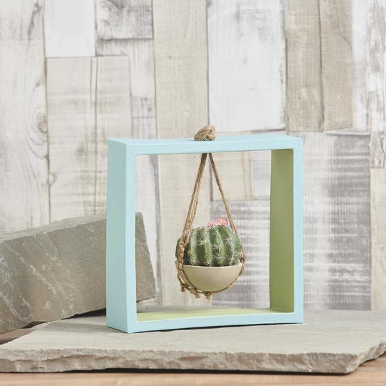 All strands are led through the hanging hole. They form a hanging basket, in which the cactus shell can be placed. The suspension is fixed in the frame by a knot. Finally protruding jute strands are removed from the knot.