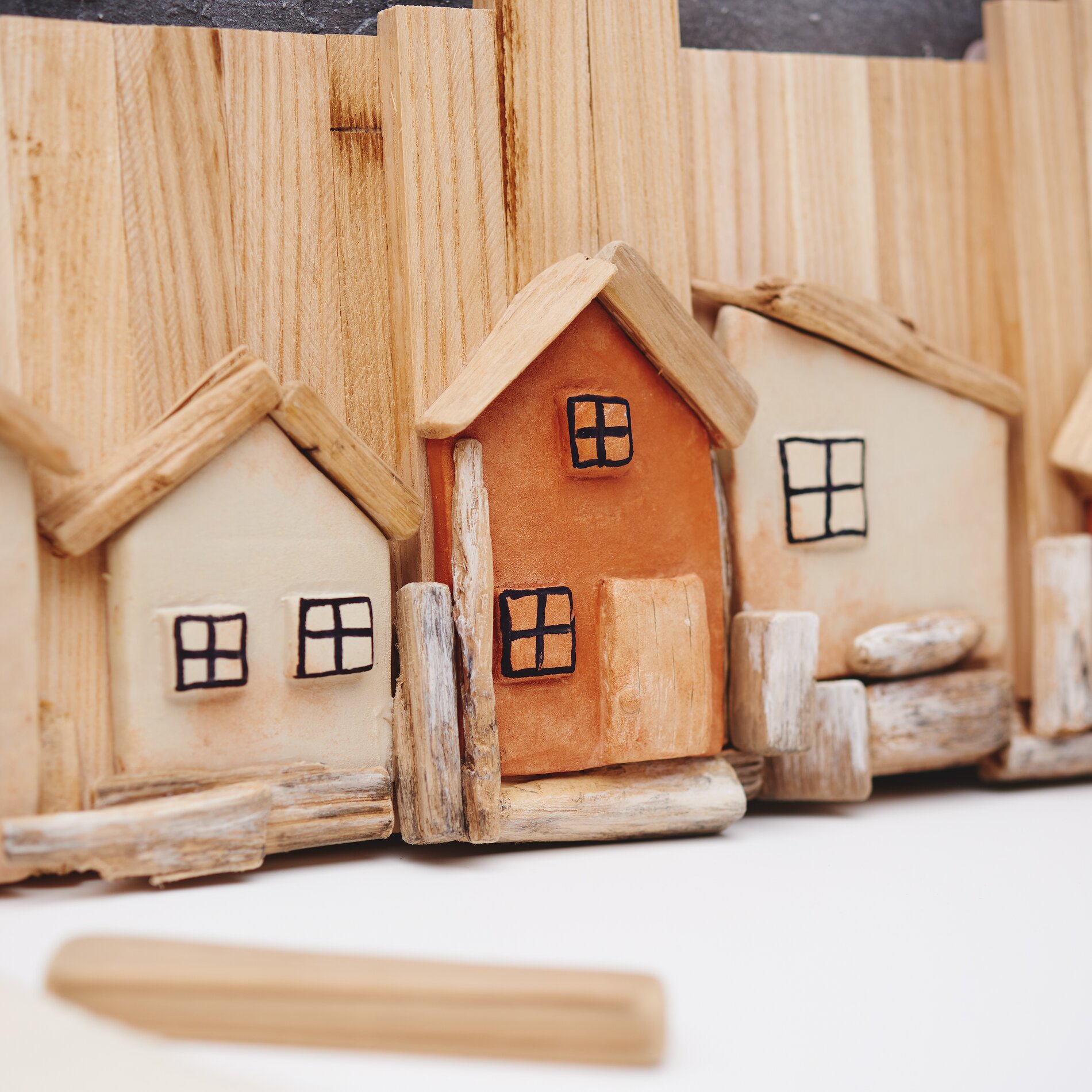 Smooth out your modeling forms and dab over the houses with a slightly damp sponge. This will give you an even surface texture. Leave everything to dry for approx. 24 hours at room temperature.
