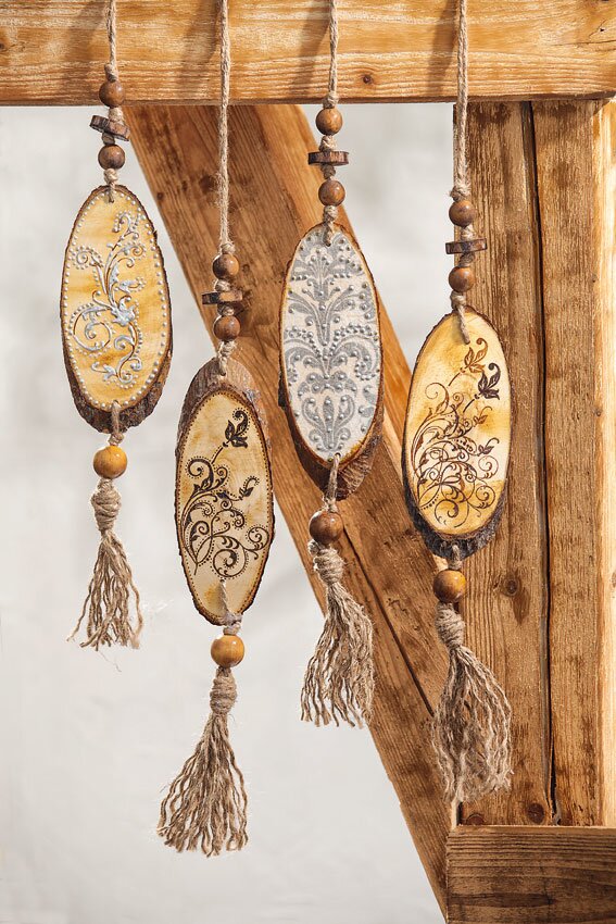 Decorations in the Nature-look are totally in. The large rustic bark slices are wonderfully suitable for decoration with different techniques.