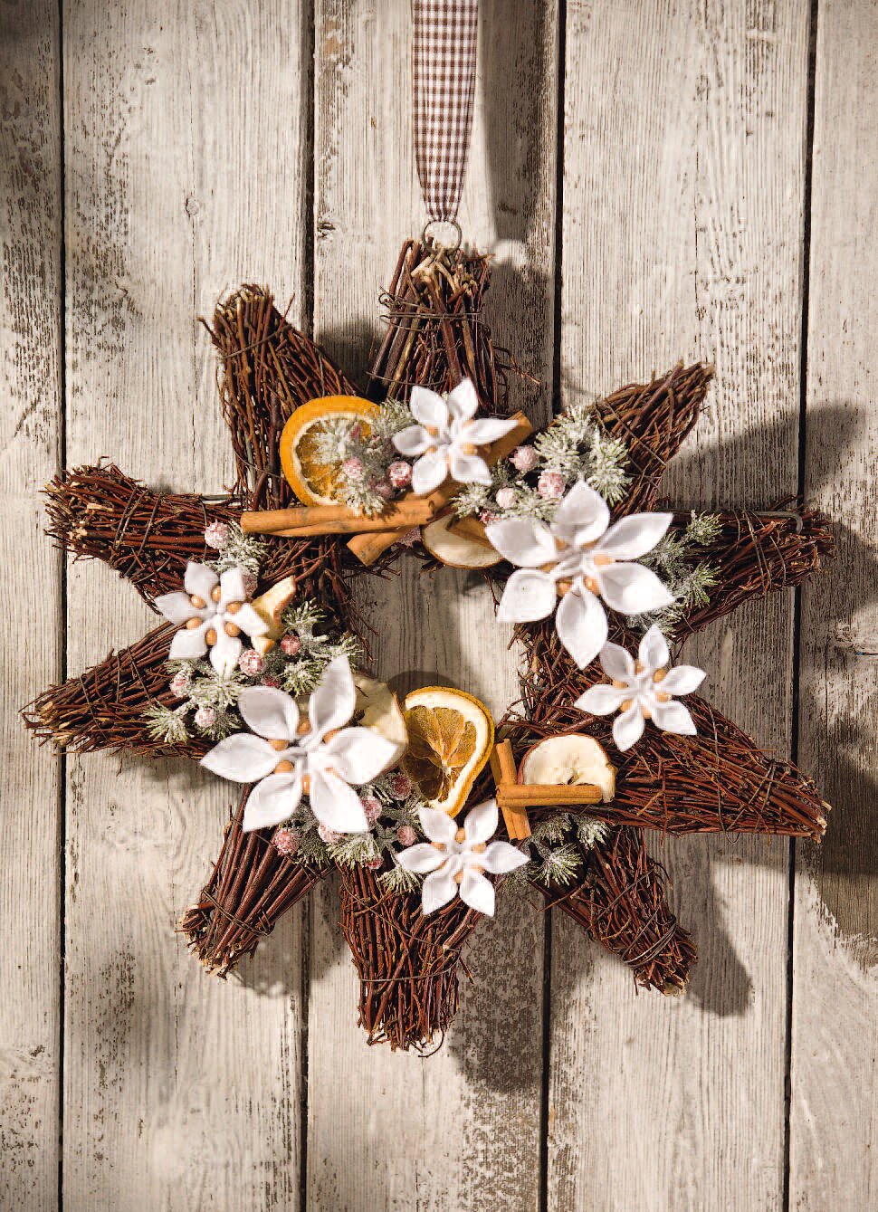 A beautiful alternative to a door wreath is this double willow star. It is decorated with homemade felt stars, dried fruits and cinnamon sticks and brings the smell of Christmas into the house.