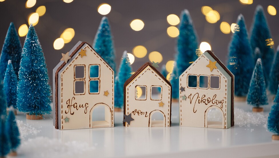 First sketch out the decorations and lettering with a pencil, which you would like to process with the branding pen. Draw with this afterwards. Paint the sides of the houses and some scattered parts with craft paint.