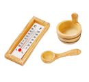 This 3-piece set of sauna accessories consists of a thermometer with a length of approx. 6 cm, width approx. 2.2 cm, a tub with a height of approx. 2.7 cm, Ø approx. 3 cm and a ladle with a length of approx. 4 cm.