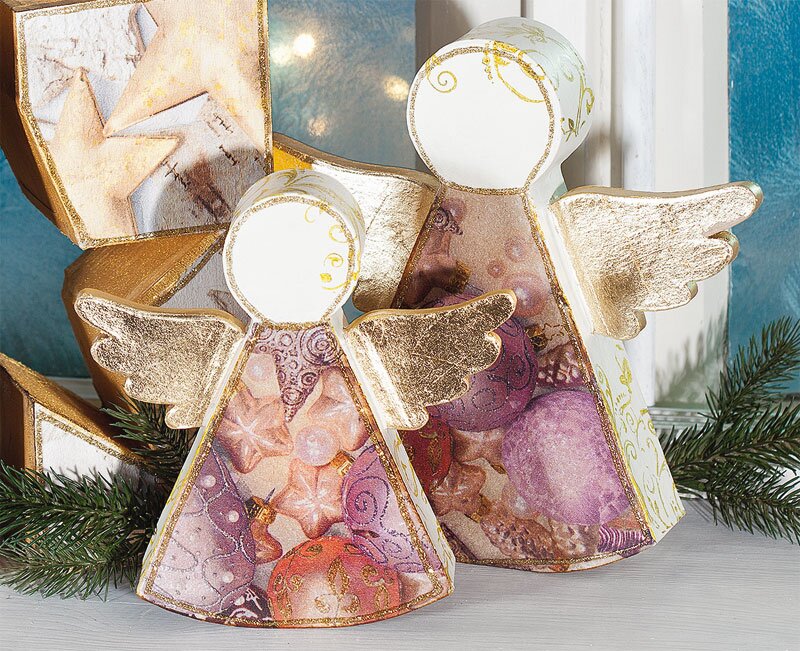 These heavenly messengers come with their wings made of gold-coloured Leaf metal with a festive shimmer. The angel dress, in subtle tones, is framed by a contour of golden glitter liner.