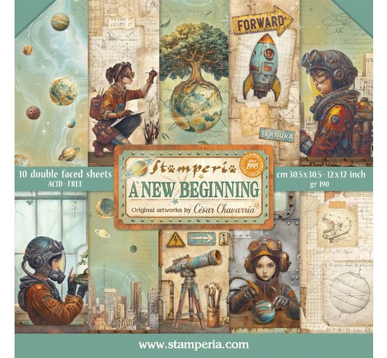 Experience a creative journey to the stars with the Scrapbook block "A New Beginning"! Design unique projects inspired by astronauts, robots, rockets, lettering, silhouettes of skyscrapers, a tree on a globe and more.