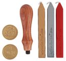 Great seal set including wooden handle. This seal set contains everything you need. The wooden handle is approx. 7,5 cm, the Sealing wax is approx. 9 cm long and the seal motives have a Ø of approx. 2.5 cm.