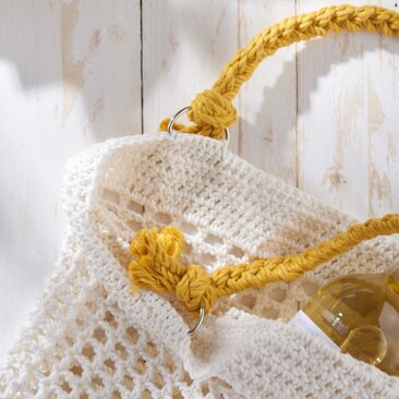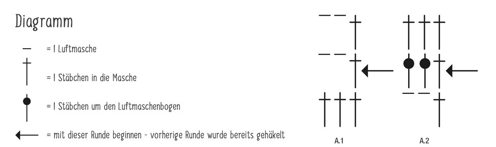 1.	ROUND: 1 air mesh (= 1 fixed mesh) 1 fixed mesh into the next air mesh, * skip the next air mesh, 1 fixed mesh into each of the next 4 air meshes *, from *-* work 28 times in total = 114 fixed meshes. Apply 1 marker thread at the beginning of the round and apply 1 marker thread after 57 firm stitches (= 57 firm stitches left until end of round)